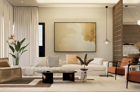 結果透過軟裝設計師的協助——換了兩盞主體燈、調整沙發位置、搭配織品色系,加上幾幅呼應風格的壁飾——空間瞬間從「租屋感」變成「精品旅宿感」。